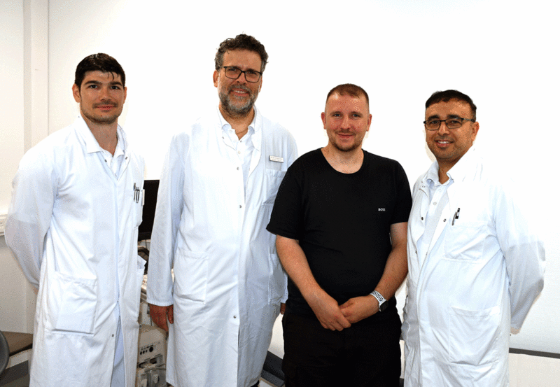 (1)Das Ärzteteam mit dem Patienten (v.l.): Nikolay Nikolov, Assistenzarzt, Dr. Christian Heinen, Henning H. und Tareq Abu-Zamzam