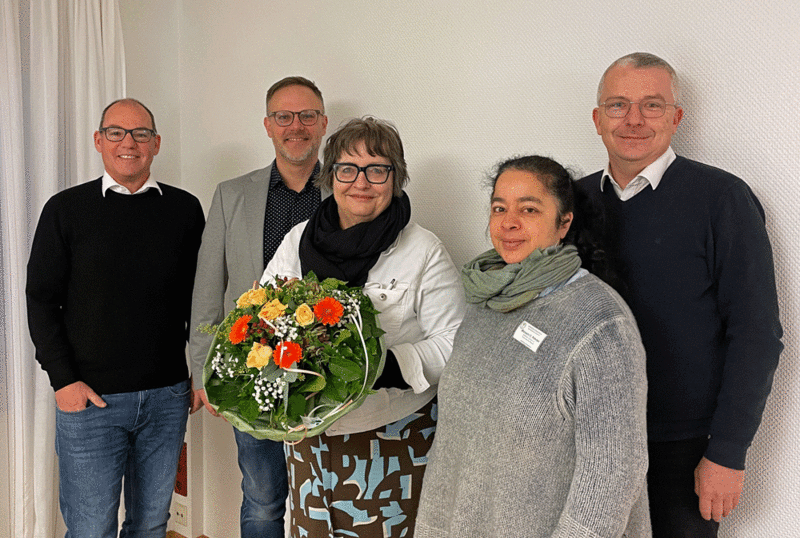 Bildunterschrift: Herzlicher Empfang für die neue Chefärztin (v.l.): Pflegedirektor Michael Puncak, CKQ-Geschäftsführer Ralph Ehring, Dr. med. Elisabet Teske, Ärztliche Direktorin Manoshi Pakrasi und Prokurist und Personal-Leiter Manfred Janknecht.