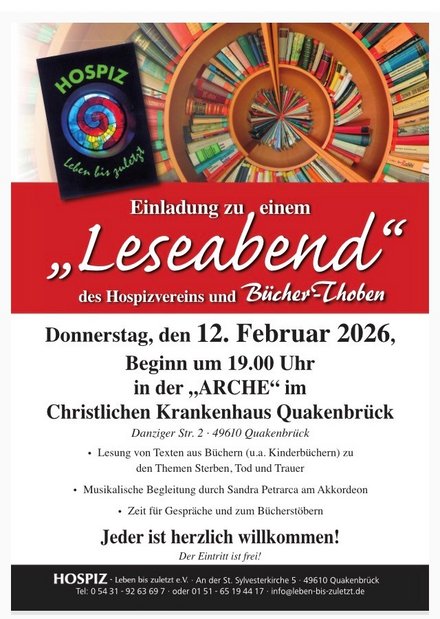Zu einem besonderen Leseabend laden der Hospizverein Leben bis zuletzt e.V. Quakenbrück und die Buchhandlung Thoben am 12. Februar um 19:00 Uhr in die ARCHE des Christliche Krankenhause Quakenbrück ein.
